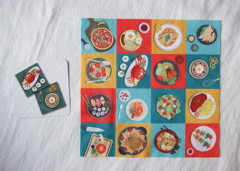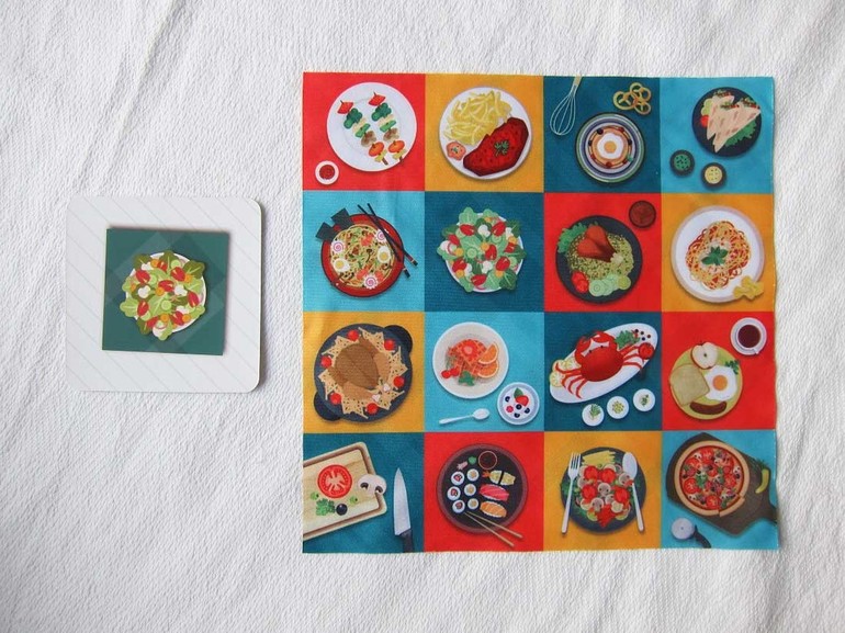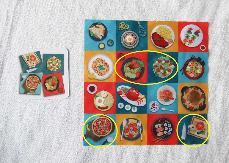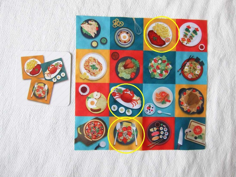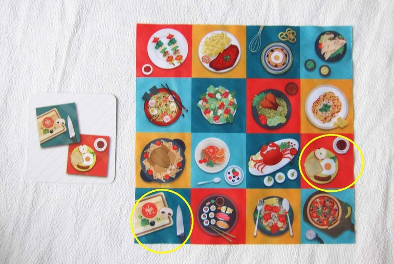 Итак, открыта карточка из бирюзовой стопки (начальный уровень) и что мы начинаем делать? Складывать? А вот и нет! Сначала надо найти блюдо на скатерти. И скажу вам, что сделать это не так-то легко. У нас были моменты, когда один уже собрал заказ, а второй еще и еще ищет на своей скатерти нужные картинки))