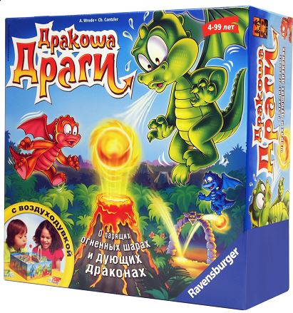 Почти действующий вулкан и состязание четырех драконов на ловкость. Задача -выдуть легкий шарик на поле с жетоном своего цвета, собрав в итоге шесть таких жетонов. Игру можно усложнить, добавив в нее элемент мемори. Но мы его не используем - соревнуемся только в ловкости. Опять же не скажу, что игра обязательная, но логопедически полезная. Подробно здесь.
