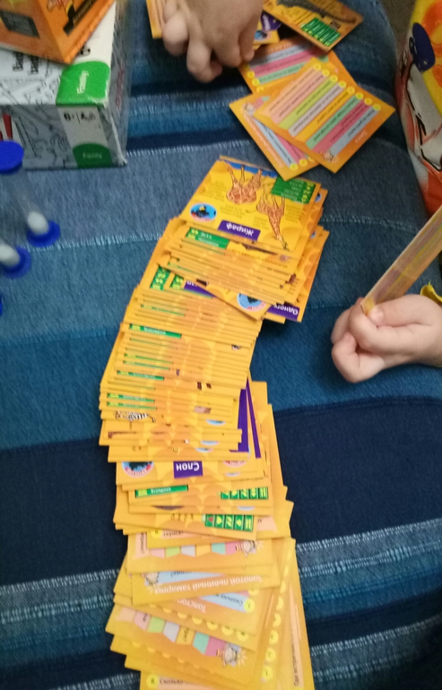 Я про них уже писала, что ошиблась с возрастом, поэтому и предложила тест драйв двум мальчикам 8 и 14 лет и девочке 10 лет. Ну для начала я с ними поиграла, но они быстро разобрались и играли потом сами. Смысл игры сравнивать машины по представленным на карте характеристикам. Помимо развлечения, изучаем понятия больше меньше) Ну что могу сказать, у молодого человека 8 лет игра вызвала просто кучу ликования и восторженных возгласов! Оо, какая Бугатти! Какая крутая Альфа Ромео! Правда, он проиграл, и пытался расстроиться, но мы быстро его переключили на другую игру) Девочка тоже играла с увлечением, особенно ей нравилось "делать" парней со словами А моя то тачка круче) а молодой человек, да, да, который 14 лет, меня удивил) он тоже с удовольствием играл с мелкими в детскую игру) Подробнее иргу показывала тут
