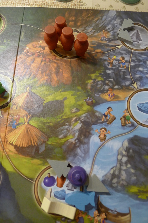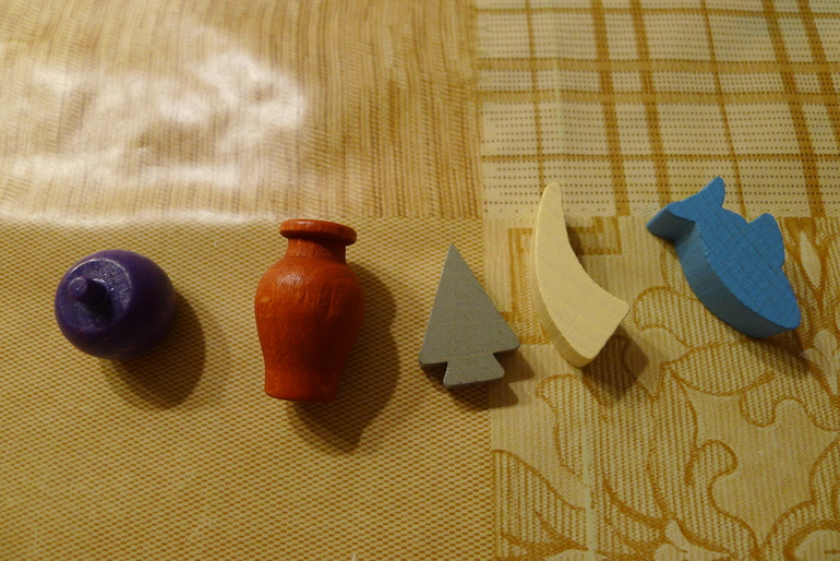 Но не все так просто. Не всегда легко попасть на нужное место, так как жетон с картинкой этого места может быть уже открыт. Приходится думать, как еще можно туда добраться. И может быть такая ситуация, что в результате обмена, необходимые тебе товары есть только на рынке, а не на своем обычном месте (или наоборот). Например, на фото видно, что кувшинов 4 вместо трех, зато на рынке нет ни одного кувшина для обмена.