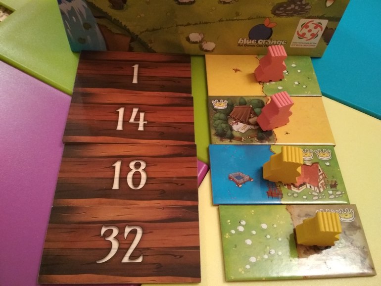 Напишу про игру для 2-х игроков. Выбираем замок и двух королей соответствующего замку цвета. Замок ставим на основание (стартовый участок), вокруг него будем возводить новые земли. Вынимаем из коробки 4 тайла (предварительно перемешав) и сортируем по возрастанию цифр. Затем переворачиваем и укладываем в порядке возрастания цифр на "рубашке".