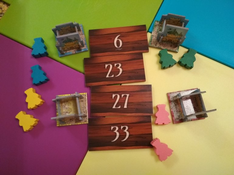 Потом один из игроков берет все фишки королей, перемешивает и не глядя достает по одному. Игроки разбирают фишки и выставляют их на приглянувшиеся тайлы. Тот игрок, чей король занимает верхний тайл - ходит первыми и далее определяются ходы по порядку установки королей на тайлах (на картинке - первый и второй ход у розового, третий и четвертый - у желтого).