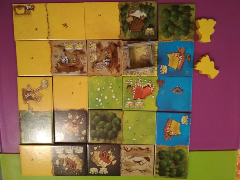 Задача игроков - построить своё королевство 5Х5 таким образом, чтобы оно еще и принесло наибольшее количество очков. Для этого нужно обязательно "захватывать" тайлы с коронами. При подсчете очков количество тайлов одной локации, стоящих рядом, умножается на количество корон в этой локации.