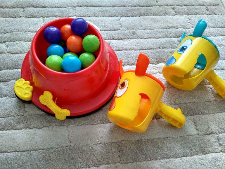 Все вроде бы банально, но в игре ест свои фишки. Детям сразу понравилось, что при нажатии на лапку в миске, основание миски начинает подниматься и шарики произвольно рассыпаются по полу :