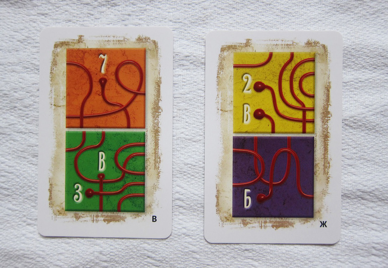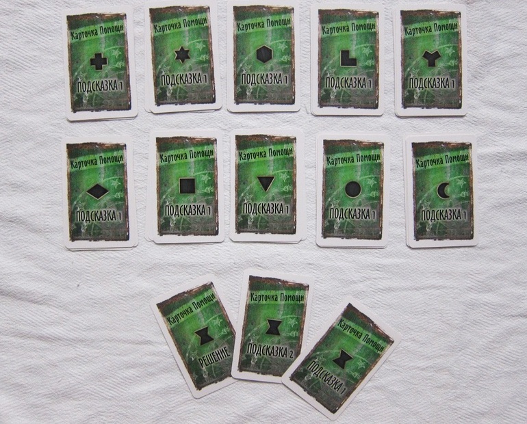 Карточки помощи делятся еще на 11 стопок (по знакам на них изображенных). В каждой стопке три карты: внизу карта решения, на ней подсказка 2, и сверху колоды подсказка 1.