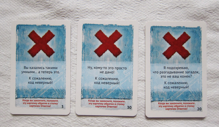 Кстати, "неверные" карточки с ответами попадаются разные. Есть такие, которые гласят "не отчаивайтесь" или "неправильная догадка", а есть и более отрезвляющие ответы))