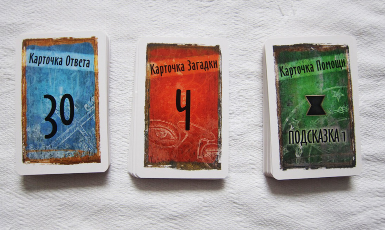 Колоду карт необходимо разделить на три стопки: карточки ответов, карточки загадок и карточки помощи.