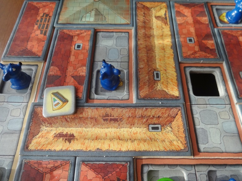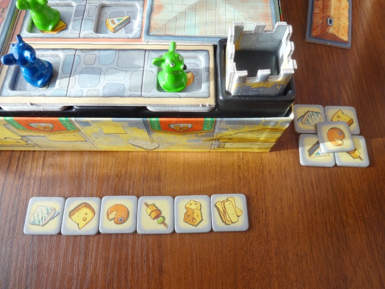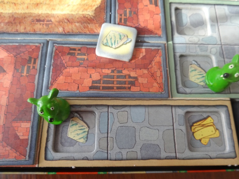 Если не ошибаюсь, в правилах указано, что надо собрать 5 кусочков сыра, мы всегда собираем все 7 (то есть время и сложность игры можно регулировать количеством необходимых кусочков, которое вы обговариваете заранее). Чтобы получить кусок сыра, нужно чтобы две мышки игрока встали на поле на одинаковые картинки. А для этого картинки сначала нужно найти, шагая и открывая крыши.