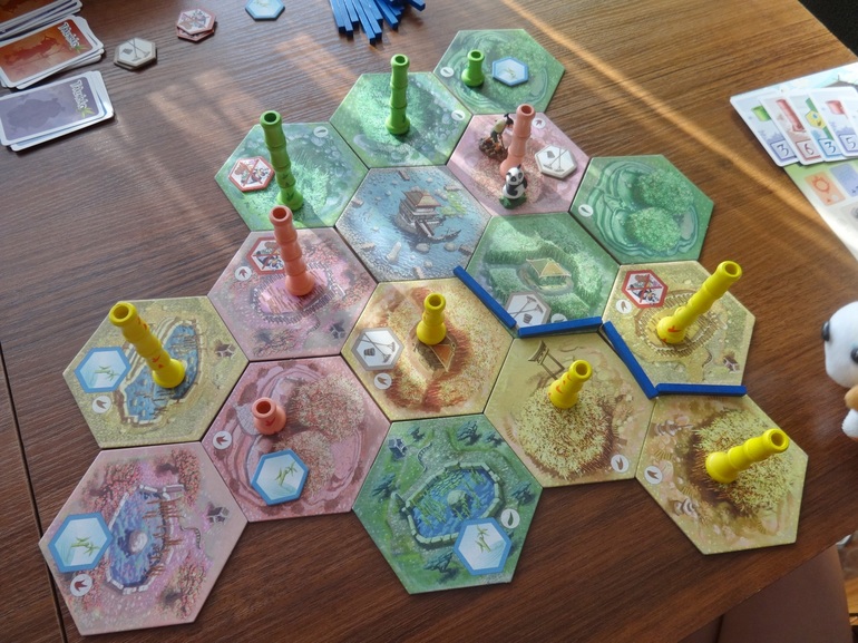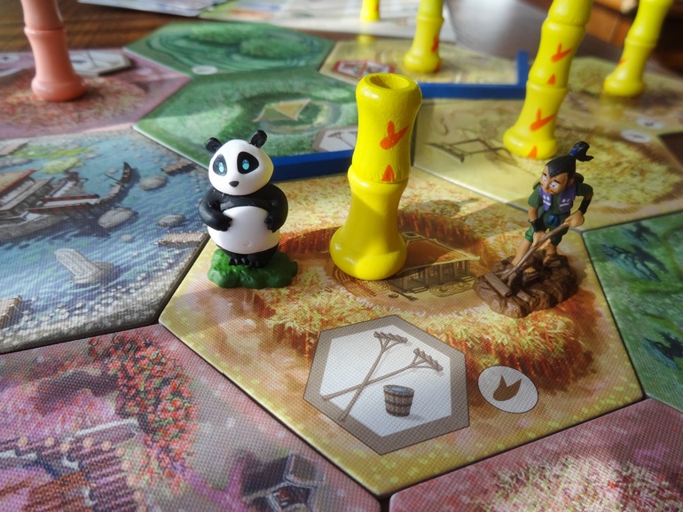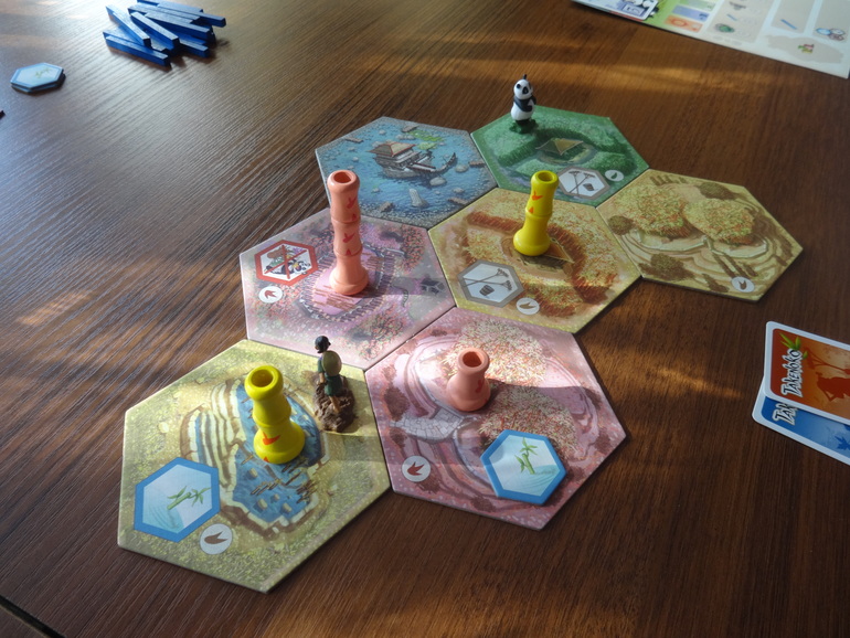 Мы пробовали играть и вдвоем (так выходит чаще всего), и втроем, и вчетвером. На мой взгляд, вдвоем не хуже, чем бОльшим составом, разве что это чуть проще - бабмбук растет, как грибы после дождя (тут, кстати, дождь его тоже иногда поливает), лишь изредка поедаемый не слишком прожорливой пандой. Так что нужные стебли вырастить не сложно, был бы выложен нужный участок сада... И панда не голодает - бамбук в изобилии на любой вкус (то есть цвет).