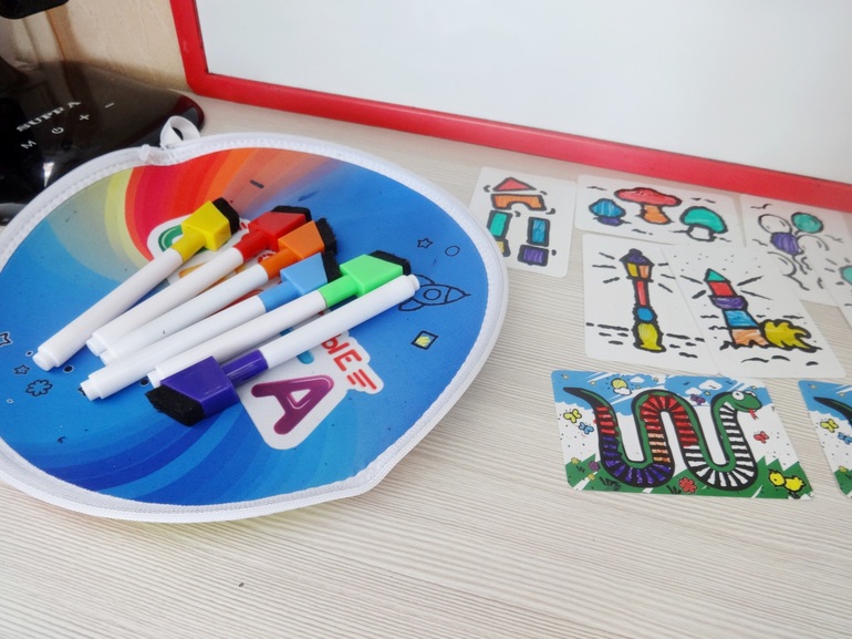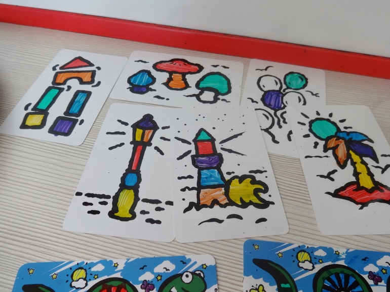 Из минусов: если играть очень часто, какие-то элементы на карточках могут запомниться, карточек всего 55 (это даст фору по времени, хотя здесь нет ничего страшного). И второе - так как в игре приходится менять колпачки у фломастеров (во 2-м, 3-м и 4-м раундах надо еще запоминать под каким полпачком какой цвет скрывается), то более светлые фломастеры пачкаются о колпачки более темных (мы уже поняли, что желтый и оранжевый цвета лучше не менять с синим и фиолетовым).