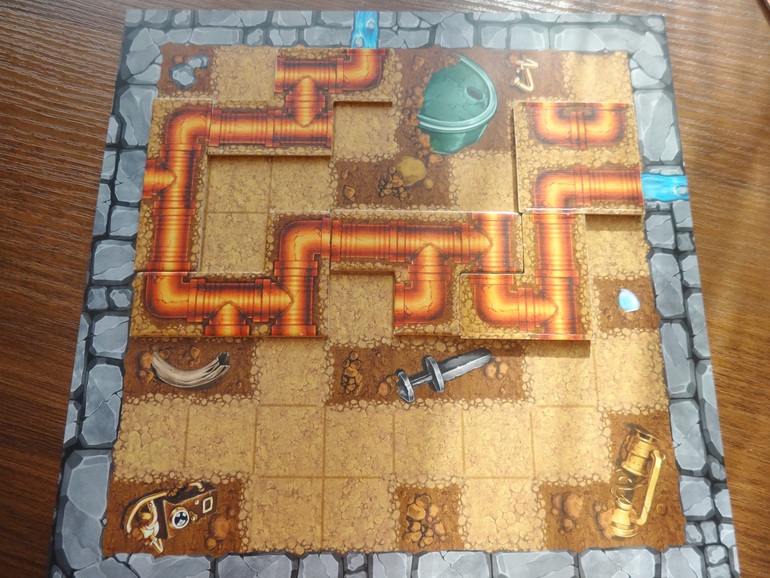 Теперь играем по всем правилам примерно на равных друг с другом (мало партий еще сыграно, трудно точнее сказать), но пока только вдвоем (игра для 1-6 игроков, одному можно просто складывать как головоломку, карточек-полей много). В сегодняшней партии первые три раунда дочка собирала трубопровод быстрее меня. Я за оставшиеся потом 30 секунд не успевала ничего сделать, поэтому сначала ощутимо отстала.