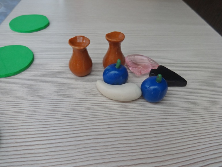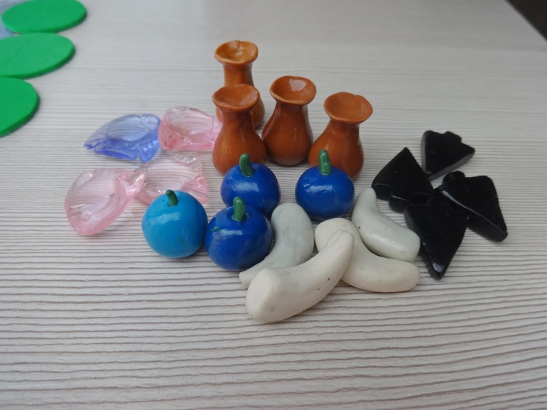 Конечно, вышло не идеально ))). Ягоды и бивни лепила дочка, наконечники и кувшины я. Кувшины никак не получались, в итоге слепила их совсем не похожими на оригинальные. В игре это не мешает. Но как дочка гордится, что она сама сделала компоненты для настоящей игры! Она постоянно порывается придумать какую-то свою настольную игру, пока не получается "законченный продукт". А тут игра почти своими руками )).