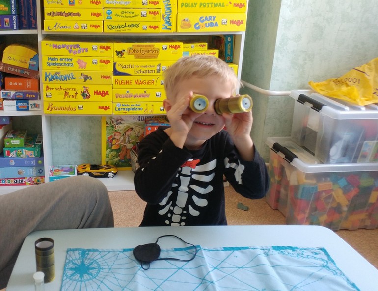 Остальные игроки,надевают свои повязки на глаз,берут подзорные трубы иирассматривают друг друга) В это время капитан Кук берет стопку карточек,отбирает случайным образом 8 карт и раскладывает их на карте. Далее кричит "Сокровища Ахой" и переворачивает песочные часы. С этого момента осталтные пираты в повязках на глазу через маленькую дырочну в подзорной трубе ишут на карте разложенные вещи и старабтся их запомнить. Конечно,взррослому времени хватит слихвой и чтоб,все увидеть и запомнить и чтоб увидеть следы от нутеллы на носу у свего сына))) а вот Миша с усердием все запоминал и бормотал под нос... бутылка с запиской...карта сокровищ.... "золотая чашка" ))))