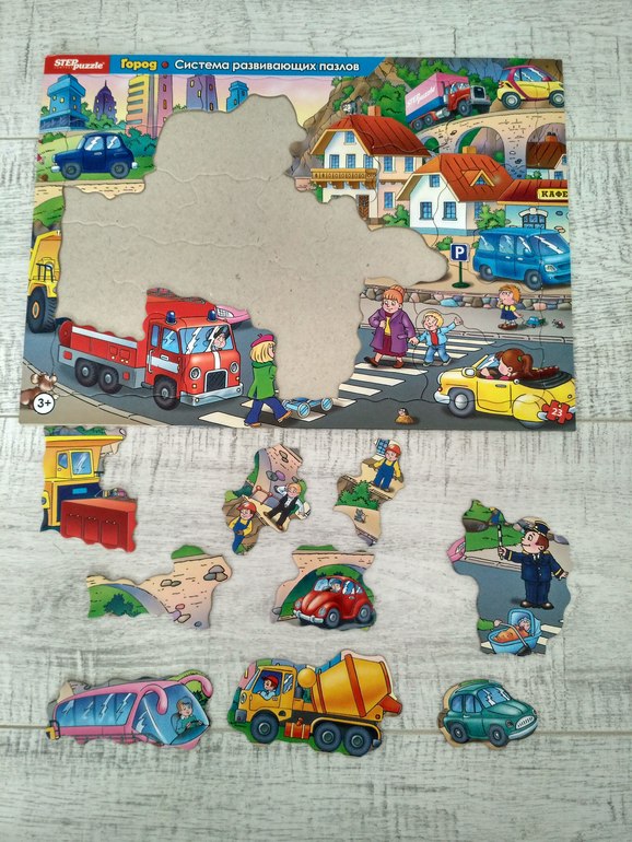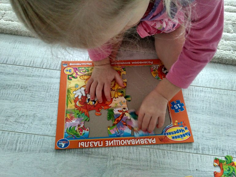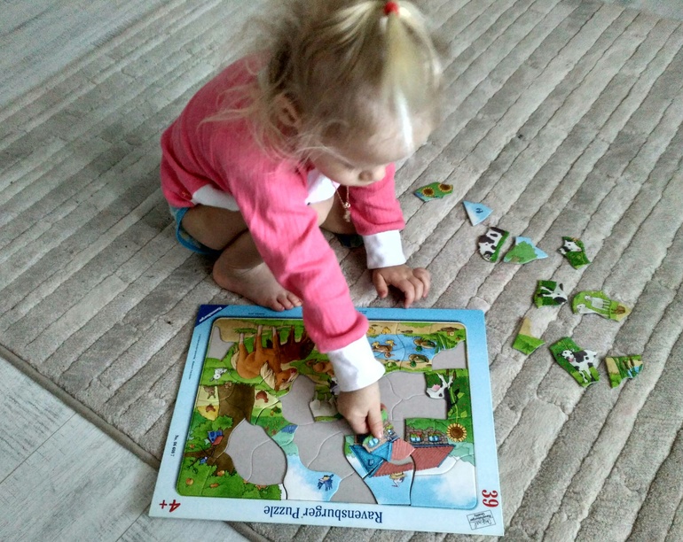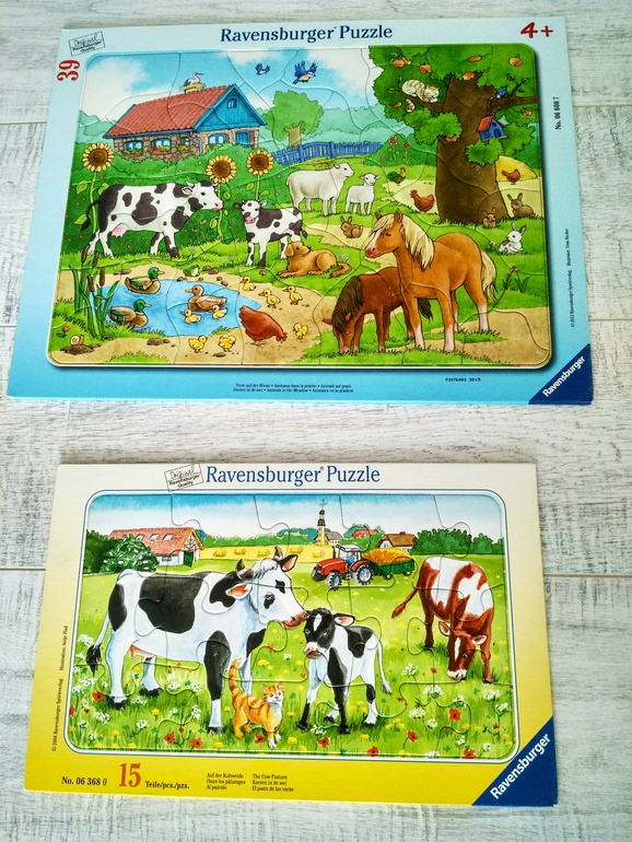 Ravensburger, хорошие качественные пазлы, особенно Даша любит ферму, там 39 элементов, собирает сама.