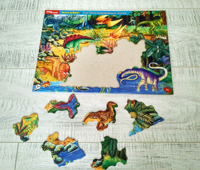 и , тоже детали необычной формы, так же как и у Ларсен на подложке нет дублирующей картинки, а видны формы элементов. Причём сами элементы есть в форме динозавров и машин.