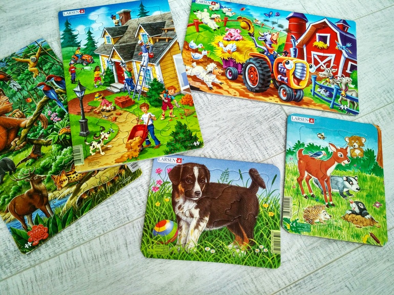 Маленькие рамки - собака и животные были собраны огромное количество раз!! Дальше купила ферму, на 16 деталей, любит, собирает..