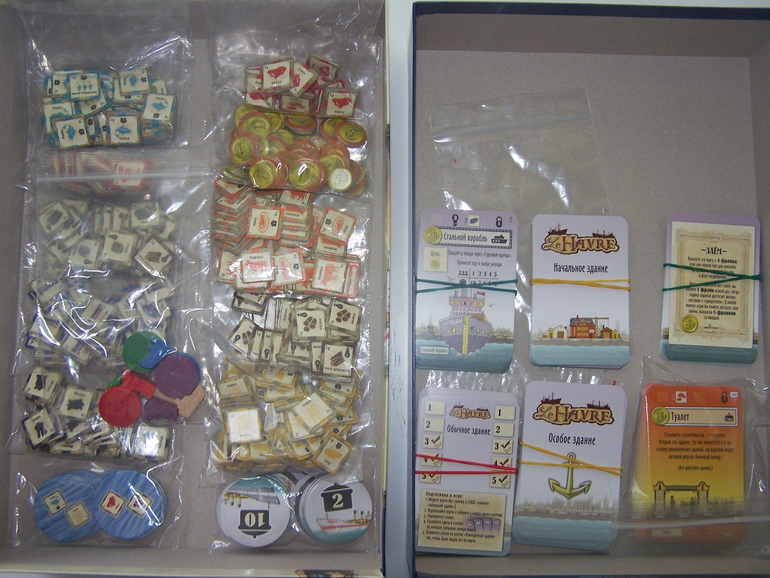В Гавр мы уже успели сыграть вчетвером. И хотя я боялась, что получится у меня, как у Аллы с Маршем муравьев (не смогли разобраться с правилами и сдали обратно в магазин), этого не случилось. Пожалела я, что не купила сразу и органайзер к игре (но согласитесь, брать органайзер по цене игры не будучи уверенной, что игра приживется, как-то нелогично). А компонентов много (качество вырубки отличное, не в пример Черепашкам, все выдавилось без потерь, а протекторы, на которые все жалуются, я не заказывала). В пакетиках (а в игре - россыпью на поле) получается очень неудобно.