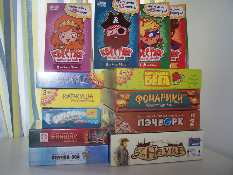 А в субботу нам привезли остальные игры. Заказывала я их на Авито. Но игры все новые, в пленке. Цена, конечно, дороже, чем в закупке, но дешевле, чем в магазине. И доставили мне их прямо домой бесплатно, и еще небольшую скидочку сделали (как раз на такую сумму, насколько дороже я купила Черепашьи бега). Ура-ура, все "горящие" хотелки временно удовлетворены.