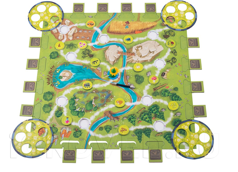12 сказочных героев помещаются под колпачками. Каждому игроку выдается пять карт путешествий: верблюд - двигается по пустыне, осел - по горным тропкам, конь - по лесу, корабль - по воде, а ковер-самолет готов доставить вас в любую точку планеты:))