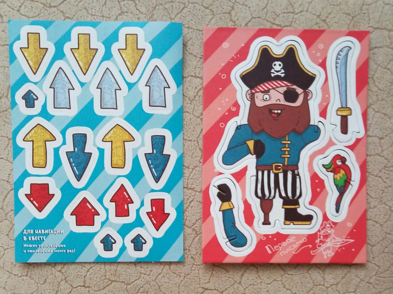 В набор входит обаятельный пират с попугаем на плече, 10 карточек - заданий, почему то 7 конвертов, стикеры для конвертов, наклейки- указатели пути, наклейки для украшения подарка, инструкция.