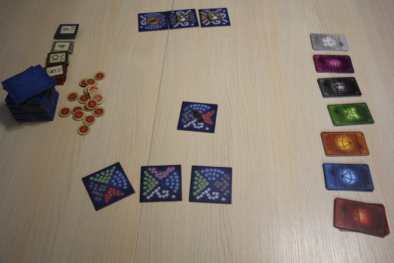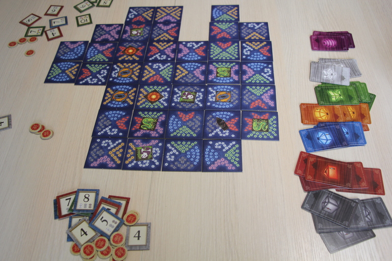 По впечатлениям игра похожа на Джайпур, но сложнее. Удивляюсь, ну как в неё играют шестилетние дети? Ведь по сути, надо одновременно подумать о многом. Каждый раз ставя тайл с озером можно продумать на ход вперед. И вариантов сразу много. Можно не дать сопернику нужный фонарь, можно себе взять одновременно три фонарика. А можно один, но нужного цвета. И с середины игры хороших вариантов хода много, несколько! И ведь нужно выбрать наилучший. Неужели в шесть лет продумывает ребенок, что сейчас поставит тайл озера сюда, а в свой следующий ход свой же тайл рядом и за ход возьмет себе три фонарики, а сопернику ни одного, потому что цвет такой закончится?