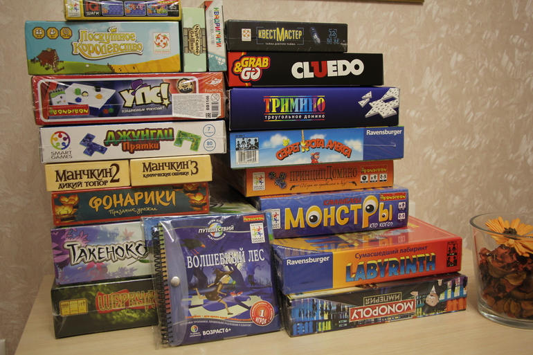 Ладно пооправдываюсь. Манчкин 2 открыт, карточки подержала в руках, сложила обратно. Нет компании для игры, а вдвоем нет интереса. Монополию купила с огромной скидкой, открывать не хочу, может подарю кому-нибудь. В Такеноко в ближайшее время поиграем. Остальные сыну на вырост.