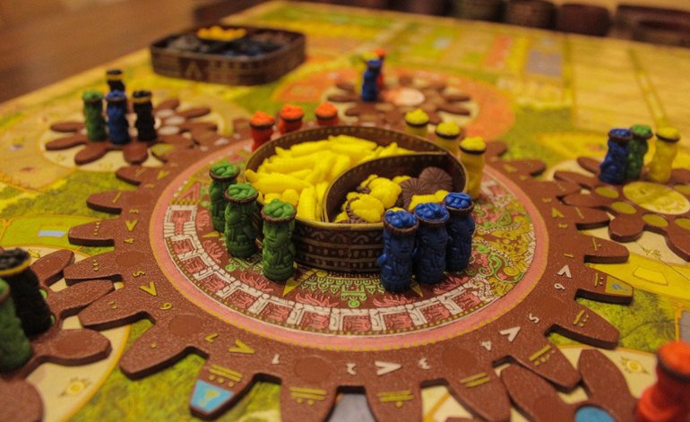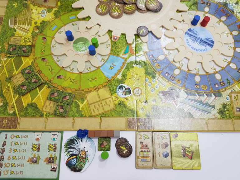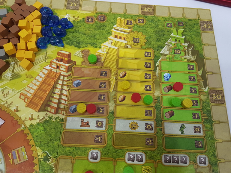 Любят боги и адресные подношения. Чем выше ступень, на которую вы поднялись в священных храмах-пирамидах богов Чака, Кецалькоатля и Кукулькана, тем больше боги благосклонны к вам и вознаграждают ваше поклонение (получаете в определенные моменты игры ресурсы или победные очки; причем не стоит оставлять этот момент на конец игры, можно и в середине игры неплохо продвинуться по очкам, полученным в храмах от богов). К концу игры я достигла вершины одного храма, но это меня уже не спасло, т.к. другим богам я молилась не столь усердно и их милости обходили меня стороной.