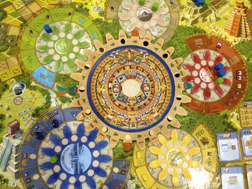 По ощущениям похожа на продвинутый "Каменный век" - рабочие приносят ресурсы или развивают технологии, но тут больше вариантов действий за ход, больше тактических решений приходится принимать и шире выбор победных стратегий. Но есть вещи, которыми в любом случае нельзя пренебрегать. Большую роль в жизни майя играли боги, несладко приходилось тому, кто их прогневает, и наоборот - за поклонение и щедрые подношения боги дарили благосклонность. Так что надо не забывать наведываться в священный город Чичен-Ица (синий круг на фото ниже), но не с пустыми руками, а с хрустальным черепом. За это боги наградят щедрыми дарами (и победными очками в том числе). Я туда ходила всего лишь раз за игру, за что и поплатилась.