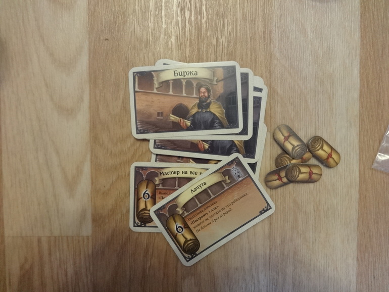 Я не жалею о покупке, т.к. с модулем Звин получилось просто превосходно, лучше, чем было. Не могли локализовать только его? Понятно, что все это бизнес, и чем дороже продадут, тем лучше. Так бы Звин рублей 500 стоил, не выгодно). Но, Биржа, нет, не соглашусь. Если каждый раунд по карте Биржи действует весь раунд, то игра превращается в какой- то детский пасьянс в самом примитивном его варианте. Можно, конечно, свитки вообще убрать, и сделать каждую карту Биржи вообще одноразовой, но все- равно- не то! Не, мы убрали и забыли про нее
