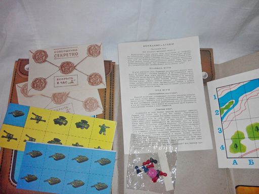 Еще одну игру плохо помню, она была кажется попроще, чем Сражение (брат говорит, что простенькая совсем), но тоже очень нравилась. У нее была необычная коробка - в виде офицерского планшета, в котором хранились карты, военные депеши и т.п. Называлась "Внимание - атака!".