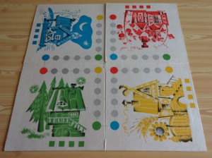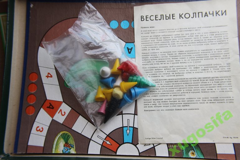 А еще была игра, по-моему, производства ГДР. Не знаю как правильно называлась. Наверное, как-то связано было со шляпками, потому что на коробке была лошадка с повозкой, в которой было много разных шляпок. Но мы звали её «Весёлые колпачки». Играли от 2 до 6 человек (конечно, самый азарт был при 6). Смысл был в том, что колпачки ходят по полю в произвольном направлении и накрывают колпачки соперников. Нашла в закромах поле, изрядно потрепанное. Но нет уже ни колпачков, ни правил. Может у кого-то сохранились правила? Буду признательна. Вот, благодаря ФМ, вспомнила о ней и горю желанием восстановить.