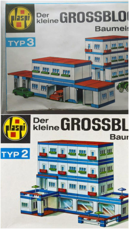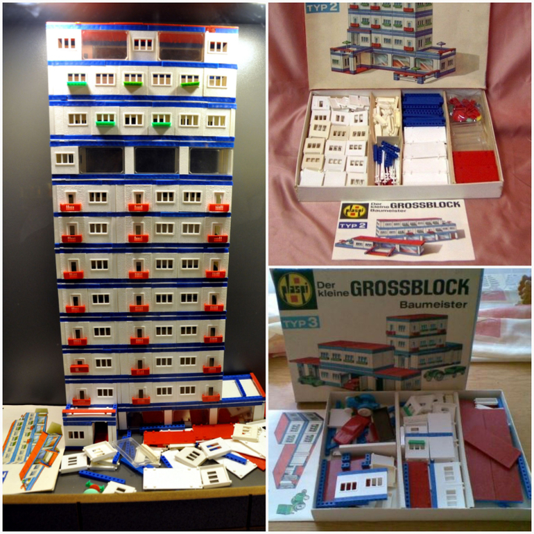 И, наконец, венцом моего мечтания был конструктор производства ГДР GROSSBLOCK. Это было что-то невероятное. Не знаю, где папа сумел его достать, но в далеких 80-х мне даже не верилось, что такое может быть. У меня было 2 набора: здание с заправкой и гаражом и высокий дом с летними кафе. Я до сих пор помню свой восторг от процесса сборки. Блочные панели, перекрытия между этажей, блоки с окнами и балконными проемами, сами балкончики и ящички для цветов. Чудо какое-то! К сожалению, конструктор не сохранился, мои младшие брат с сестрой без особого трепета относились к нему и в итоге после того, как была утеряна основная масса деталек, мама простилась с ним. Очень жаль. Фотки нашла в интернете.