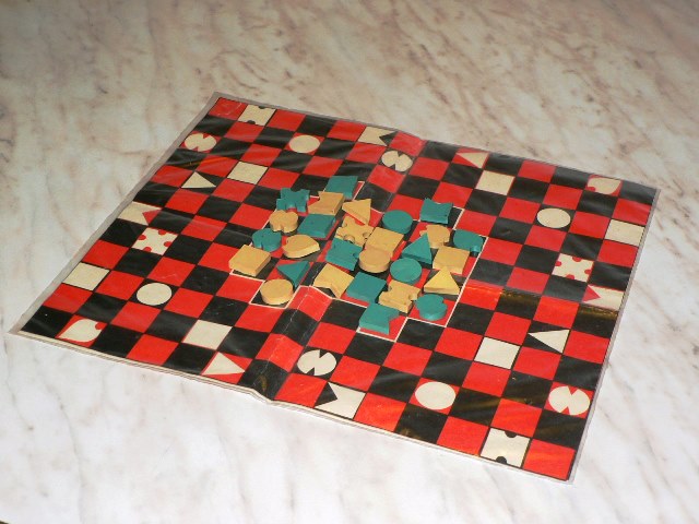 Дуэльный абстракт По местам. Название точно отражает основную задачу - расставить по местам свои фишки. Кто быстрее, тот и молодец. Это такой вариант уголков, только движение начинается от центра к краям. И каждую фишку надо разместить строго на определённых клетках.
