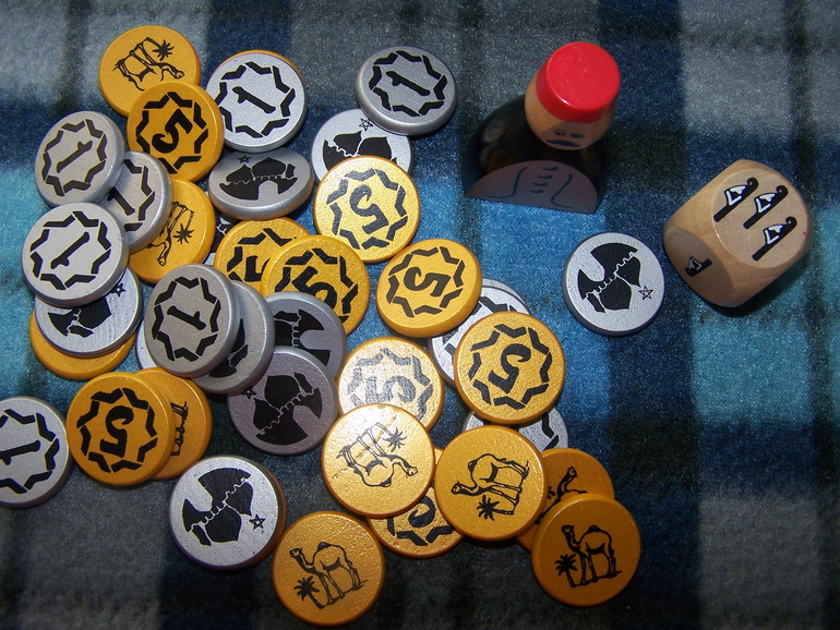 Перед игрой все игроки получают стопочку ковров своего цвета, и красивые серебряные и золотые монетки (они деревянные, и очень приятные на ощупь).