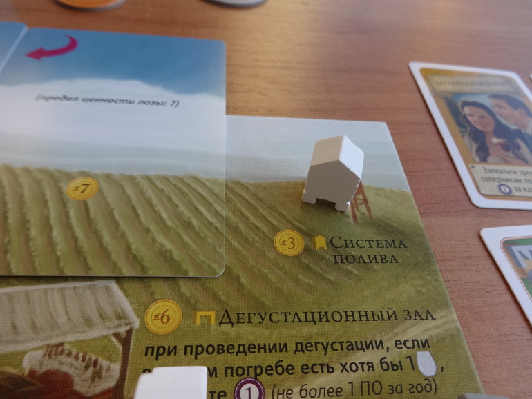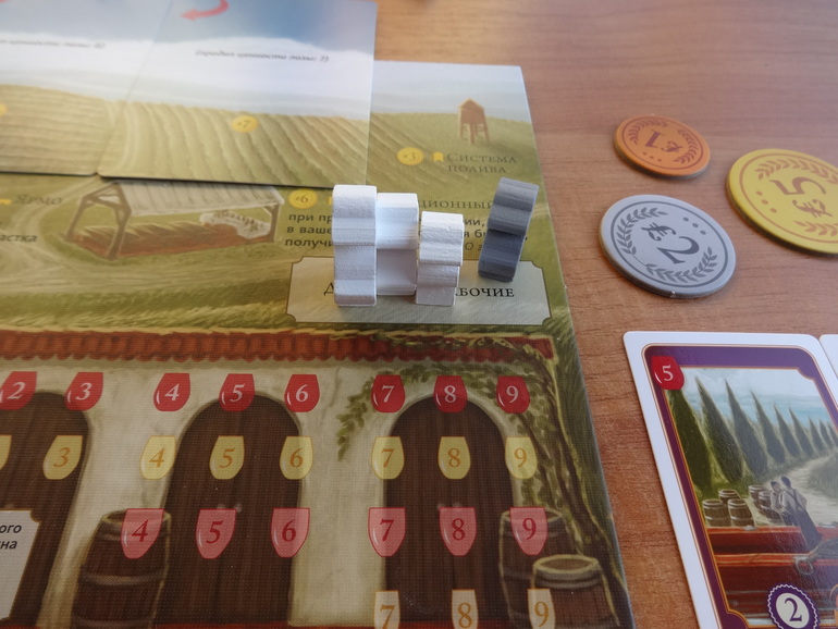 Участки, которые вы выставляете на своих индивидуальных планшетах, на них вы выращиваете свой виноград, стоимость 5,6 и 7 лир. Их можно продать в течение игры, и получить за это деньги: