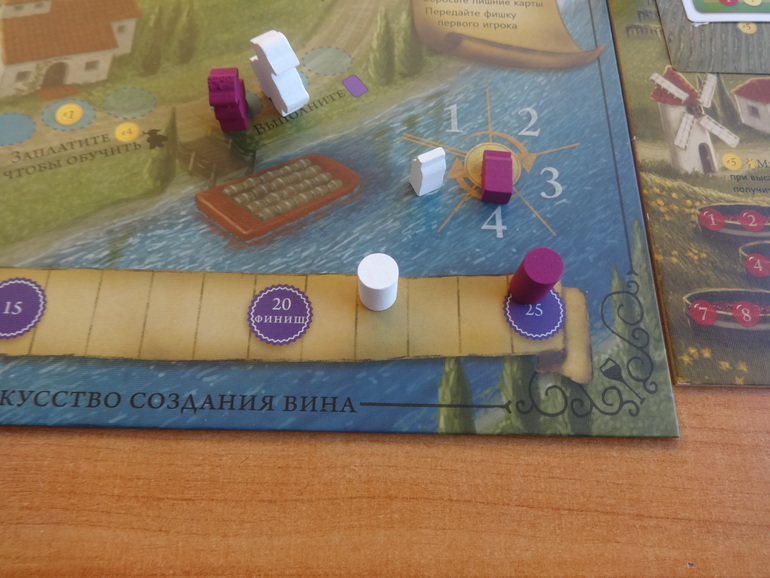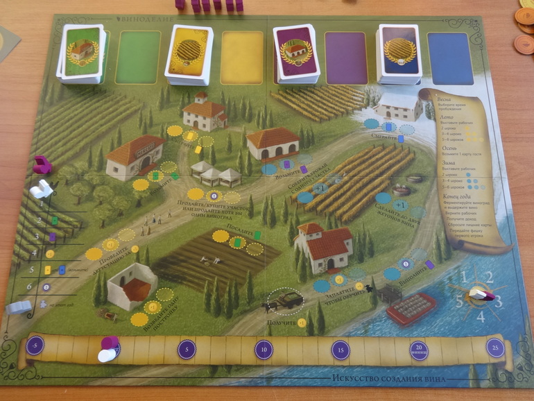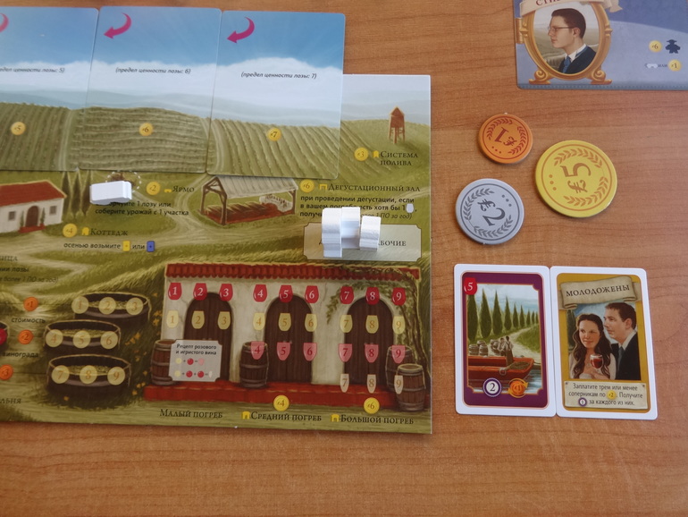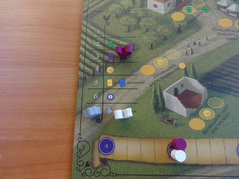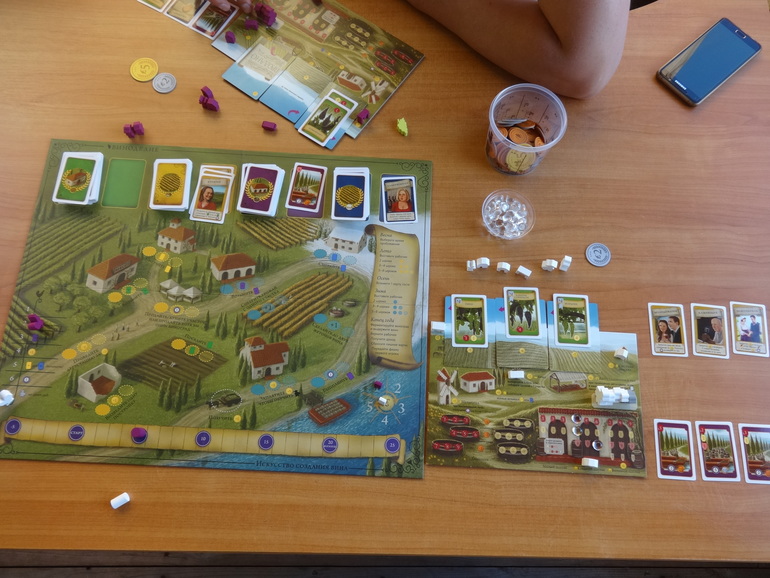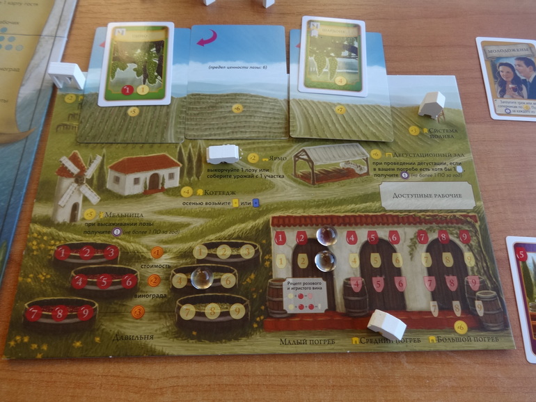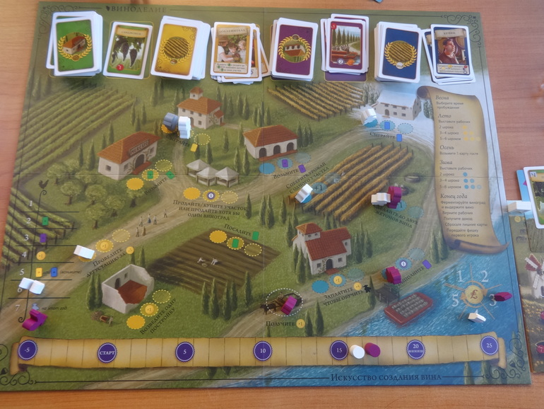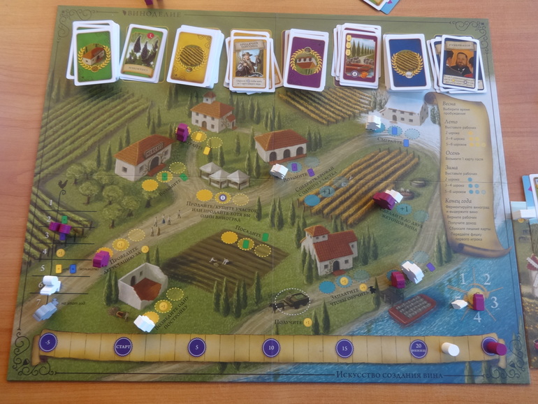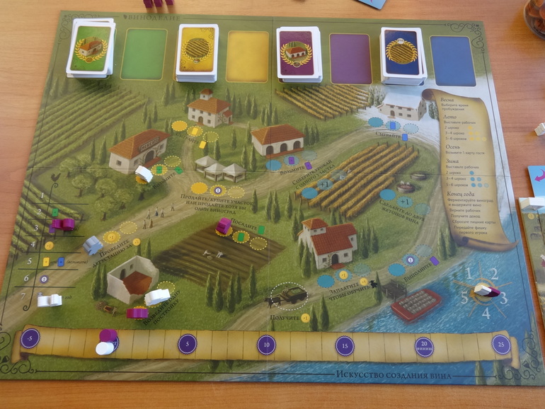 Общее игровое поле с разложенными картами лозы, картами летних гостей, заказами и картами зимних гостей. Слева стоят ваши петушки, они определяют, кто будет в этом году ходить первый, а также приносят всякие бонусы, в зависимости от того, где вы их расположили в начале игры: карта лозы, карта заказа, карты зимних и летних гостей, деньги, победное очко, серый рабочий, который может работать на вас. Множество- множество вариантов, девочки, в игре. Наши фишки стоят на старте победных очков, наши бутылочки стоят на старте получения прибыли :