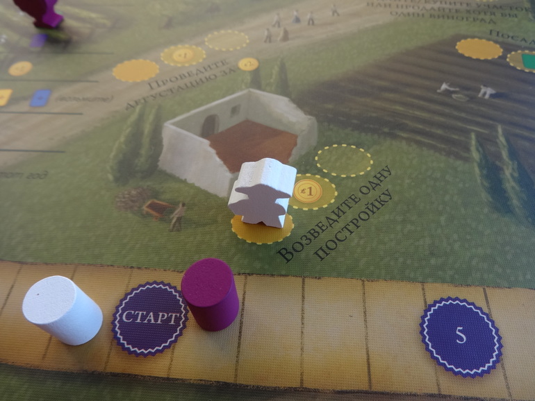 Лето в разгаре. Муж ( фиолетовый цвет ) выбрал посадить лозу и построить здание. Я ( белая ) - продегустировать вино , получив за это 2 монеты, сыграть карту летнего гостя, которая досталась мне от мамы и тоже построить здание с помощью главного большого рабочего:
