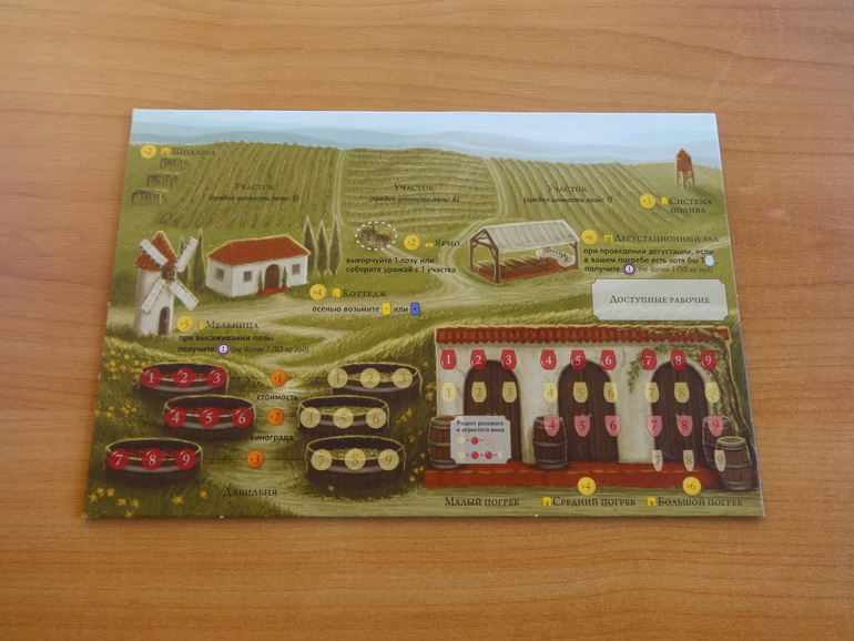 Вы винодел. У вас есть начальный капитал, какие- то постройки, деньги, доставшиеся вам в наследство от папы и мамы. И вы начинаете собственное дело. Вам надо выращивать виноград на своем участке, строить полезные здания на своем личном планшете, собирать виноград, делать из него вино четырех разных видов и выполнять заказы клиентов. За это вы получаете победные очки. Как только любой игрок пересек деление 20 на шкале победных очков, текущий год доигрывается до конца, и игра заканчивается. У кого больше победных очков, тот и победил. То есть очков можно набрать больше, и даже успеть до конца года обойти того игрока, который первый пересек деление 20. Чем мне очень понравилась игра, так это своей вариативностью! Более того, я наконец поняла, что мне нравится во взрослых стратегиях. Это когда очки можно набрать разными способами, и действовать абсолютно по разному. А здесь вариантов как заработать победные очки множество. Это, конечно, и выполнение заказов- квестов, и разыгрывание карт летних и зимних гостей, и бонусы от постройки разных зданий, и дегустация вин, и обмен денег на победные очки, даже путем расстановки в самом начале каждого года можно получить победное очко. Также и деньги можно получить несколькими разными способами, очень интересно. Всё как я люблю. Более того, в чем фишка самой игры- это обалденный выбор в плане расстановки рабочих. Как сказал Безнал в своем летсплее, и я с ним полностью согласна, эта одна из лучших игр на расстановку рабочих. Множество вариантов: и посадить лозу, и построить здание, и сыграть карту летнего или зимнего гостя, и обучить нового рабочего, и собрать урожай, и получить деньги, и выполнить заказ и еще много- много всего. Я прямо пищу от восторга! Столько вариантов действий, всё хочется, но надо так продумать свою игру, чтобы и работников хватило, и все свои планы удалось осуществить. При этом игра не является мозголомной, очень даже все понятно.