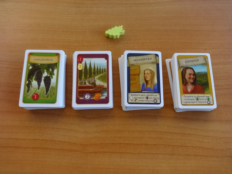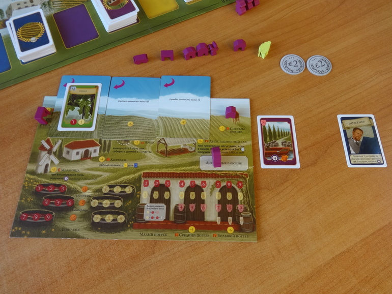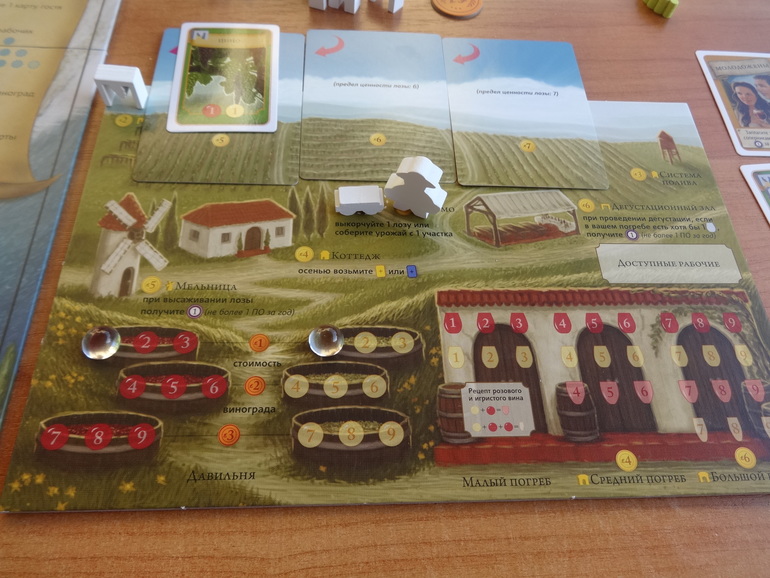 Фишки зданий, которые вы отстраиваете на своих планшетах, и которые вам необходимы для высаживания лозы и изготовления вин, а также другие здания, которые при их постройке, приносят вам деньги, бонусы и очки в течение игры. Фигурки рабочих, самая большая- фигурка старшего работника, очень незаменимый персонаж :