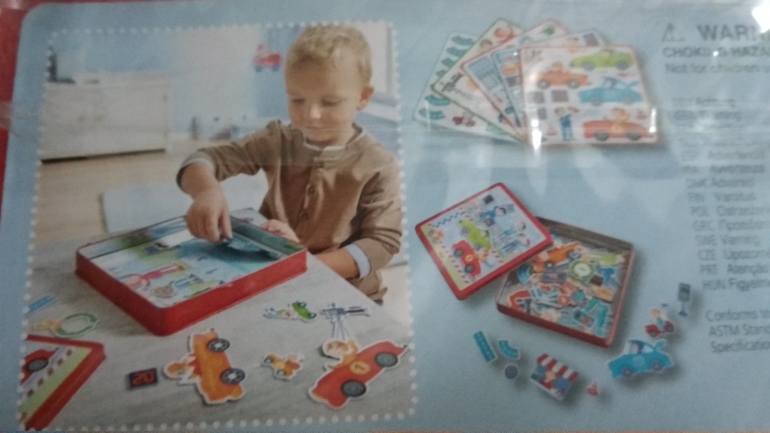 Далее две магнитные игры в жестяных коробочках- ничего особенного ,просто милые и качественные. На тему машинок и рыцарей с драконами.Очень много листов с детальками и 4 ,кажется, двусторонних листа с декорациями,чтоб вложить в коробку жестяную и играть.