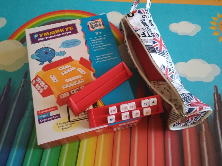 Следующее приобретение "Руммикуб". Давно смотрю на нее, но обилие мелких деталей опять же, смущает. Решила взять недорогую версию (около 200 руб.), чтобы не жаль было потерять компоненты. Цифры предварительно нужно наклеить на белые квадратики. Коробочка, конечно, огромная для нескольких деталей. Для поездки переложили в пенал.
