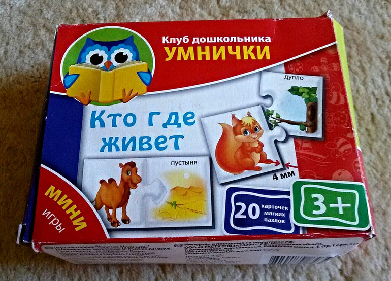 Набор состоит из двадцати мягких карточек-пазлов, часть из которых с изображением довольно симпатичных животных, а вторая часть с изображением их домиков, которые по результатам заданий складываются в полноценные картинки животного возле своего домика. Всего получается десять пар.