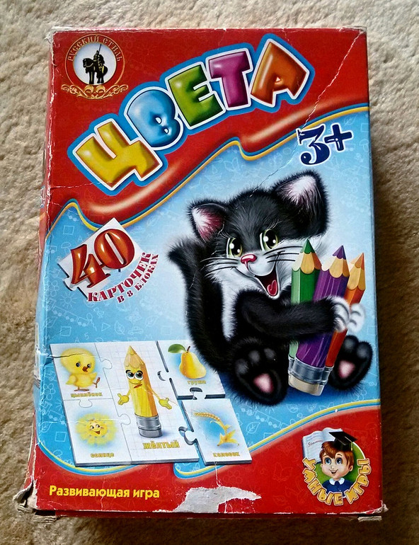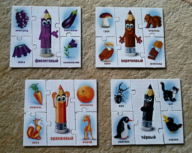 В наборе восемь цветов, изображенных в виде карандашика: красный, оранжевый, желтый, зеленый, синий, фиолетовый, коричневый и черный. К каждому карандашику нужно подобрать четыре картинки этого же цвета. Крепятся детальки в виде пазла, у каждой есть свое место. Соединяются с центральной деталью хорошо и плотно, не распадаются. Готовая картинка лежит ровно. Картон у деталей плотный, цвета яркие, картинки понятны и знакомы малышам.