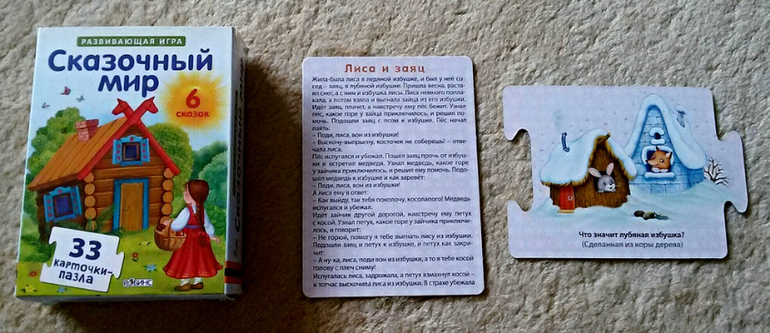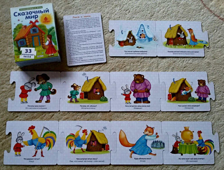 Чтобы малышу было легче ориентироваться в карточках, иллюстрации к одной сказке помещены на карточках одного цвета. Все карточки-пазлы подходят и соединяются между собой, поэтому ребенок сможет создать свой собственный сюжет сказки.