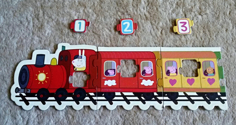 Веселые вагончики-пазлы помогут малышу в игровой форме выучить цифры, запомнить их порядок, научиться считать. Яркий паровозик изготовлен из прочного картона, на каждом вагончике изображены герои мультфильма про свинку Пеппу и ее друзей.