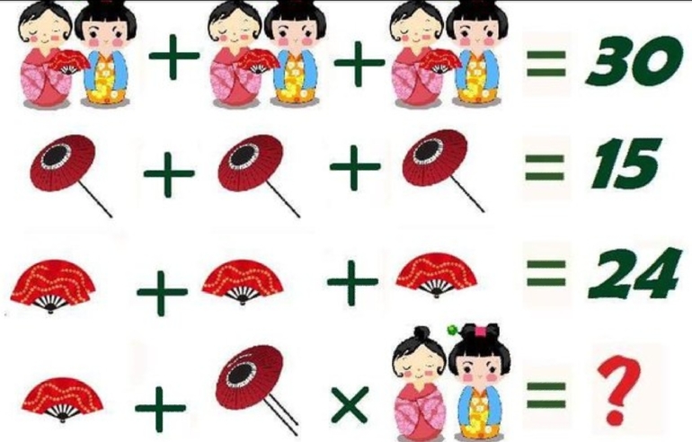 Дальше начнем с умножения: дамы без веера =4, два зонтика =10, значит произведение 40. И прибавляем один веер 6, всего 46.