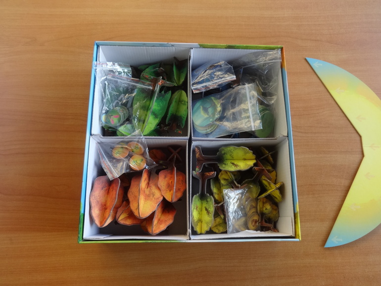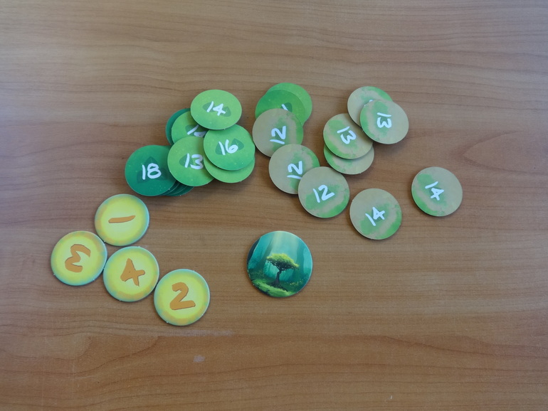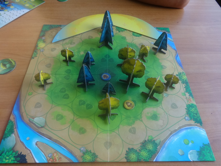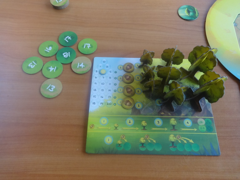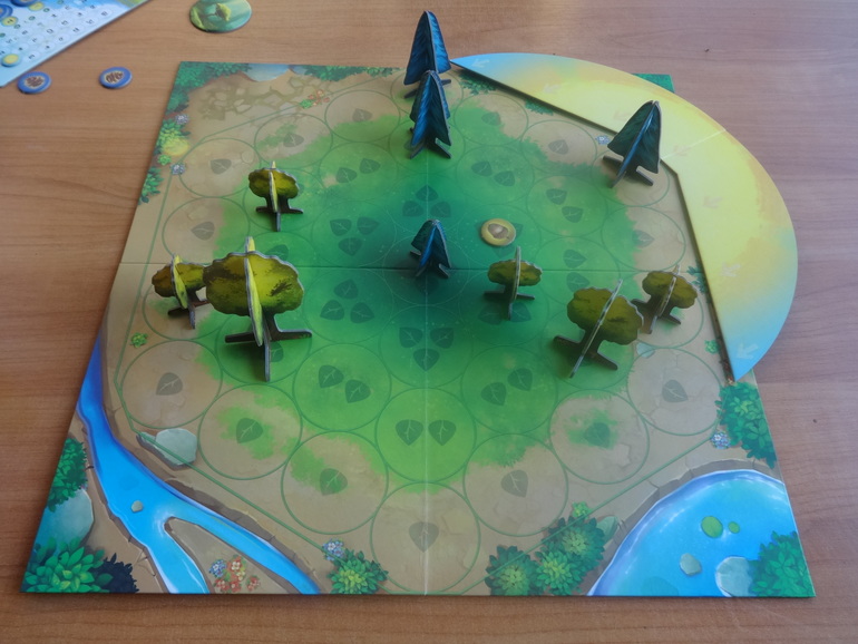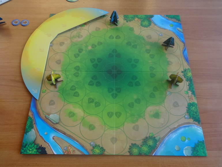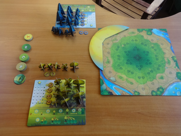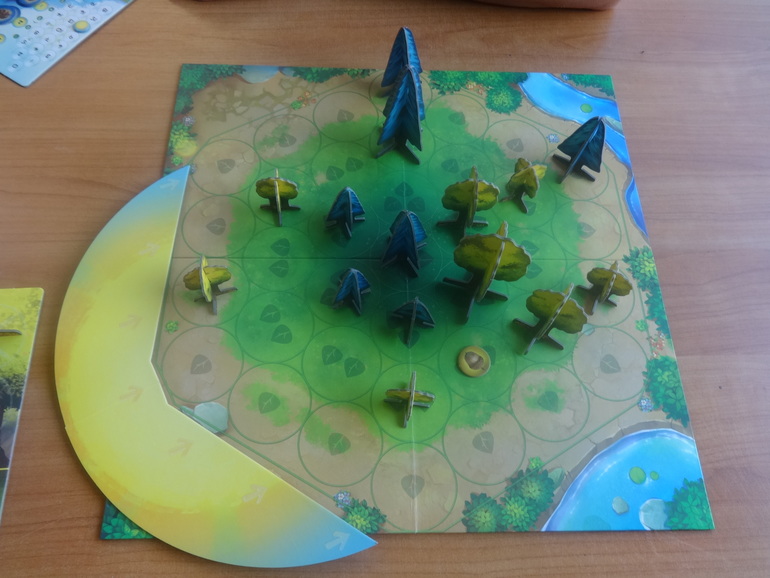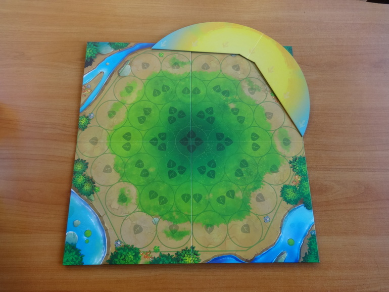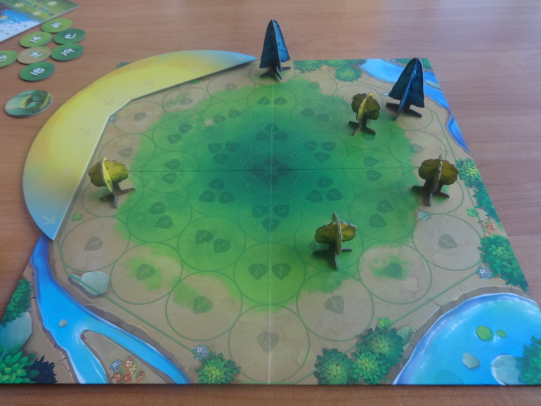 Раскладываете основное поле, где будут расти деревья, устанавливаете диск солнца, рядом кладете жетоны победных очков и счетчик полных оборотов солнца: