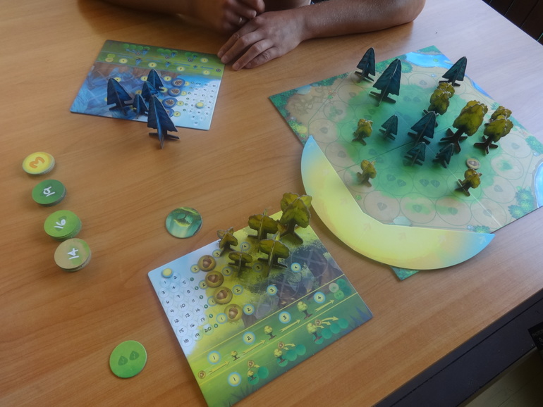 Игра несложная в плане понимания правил, вхождения в игру, и вообще осознания того как играть. Но нелегкая , недетская. Чтобы выиграть надо пораскинуть мозгами. Как лучше расставить свои деревья, чтобы они принесли вам больше очков фотосинтеза в зависимости от положения солнца, как закрыть своими деревьями деревья противника, не забывать менять большие деревья на победные очки, причем делать это и не рано и не поздно. Рано поменяете, останетесь без очков фотосинтеза, будете менять поздно, противник уже все хорошие разберет. А сверху кучек очков больше, чем внизу. В общем, "шахматы" в лесу.
