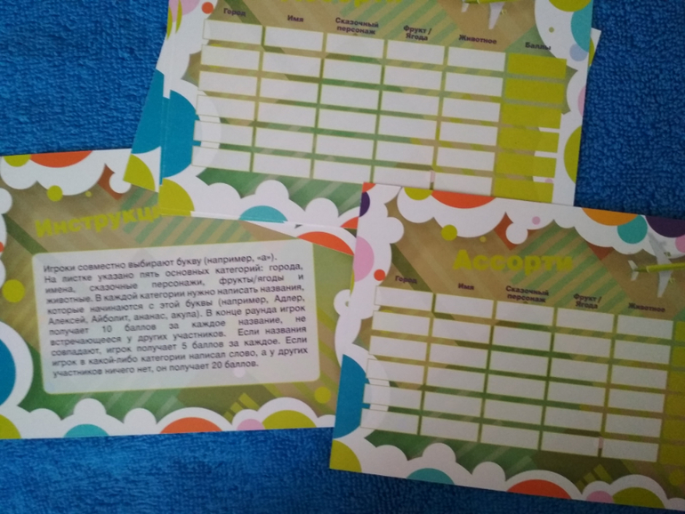 Игра "Ассорти" представляет собой поле, где в пустые клетки нужно записать на определенную букву город, имя, сказочного персонажа, фрукт и животное. Ребенку это, кстати, не так просто сделать. По правилам, если название не повторилось ни у кого из соперников - за него 10 баллов, а если повторилось - только 5. Набрал больше баллов - выиграл. Вполне достойная игра даже для поездки в автомобиле. Да и ничего не стоит самим в блокнотике или на листочке записывать.