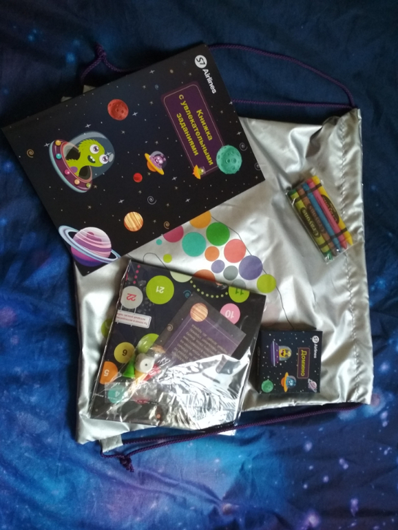 На обратном пути получили игры с тематикой космической. Тоже книга с заданиями (другими), интересное домино, классическая игра - ходилка и фирменный серебристый мешок, уже с ракетой.